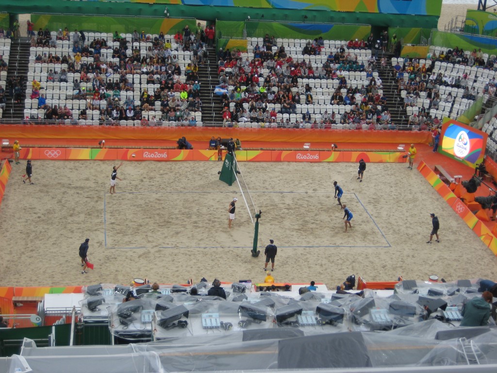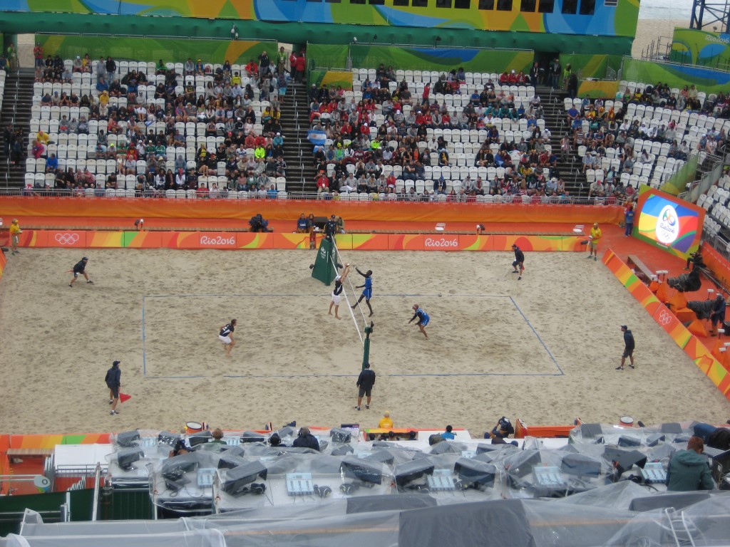Italy vs Brazil men (Brazil won 2:0) – Very close and very exciting game. Even journalists dared to come out. One of the Brazilian players landed badly and hurt his ankle in the start of the game. They took a medical break. I was about to think that it was a short game π but he continued. They played very well until Brazil made a mistake that the referees didn’t count. Italians were furious. It cost them the set. One Italian player commented also later that they weren’t heard. There was nothing to do. But great game.