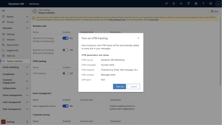 When switched on ( yes, this will be a feature you can either switch on or off, depending the need from your business) D365 Marketing will automatically add UTM parameters to all of your messages. You can either use the default parameters or you can change them and add custom UTM campaign parameters.