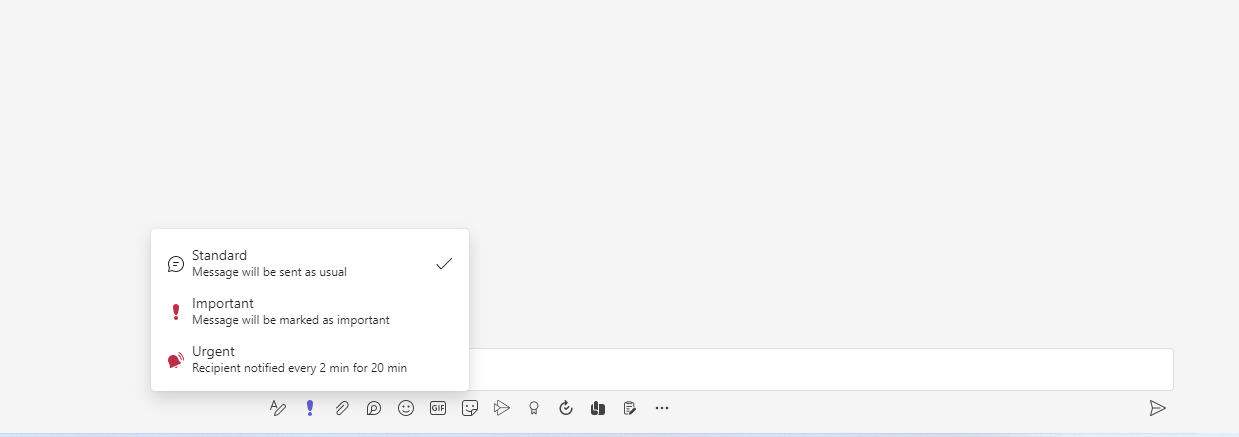 So with normal chat you have a small exclamation mark under the message box. When you click on it, you get 3 options: Standard, Important and Urgent. Those possibilities are a quick way of indication the type of the message you are sending. Especially the urgent one that will notify the receiver every 2 min for 20 min after the message was sent.
