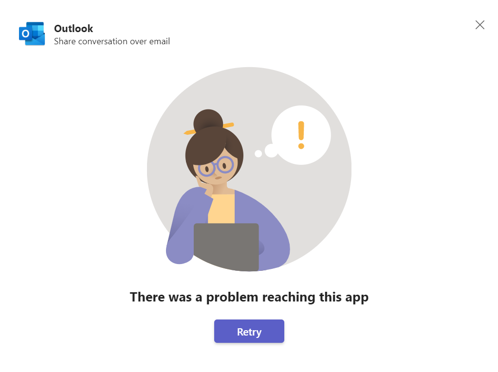 So, the only option that is very confusing, is the fact that you have the possibility to click on the edit option called Share to Outlook. But what happens is, that it opens a new window and then gives an error. Saying that Teams is having a problem reaching the app. You also get a button underneath, that says Retry. But, no matter how many times you press that, it won’t succeed.
