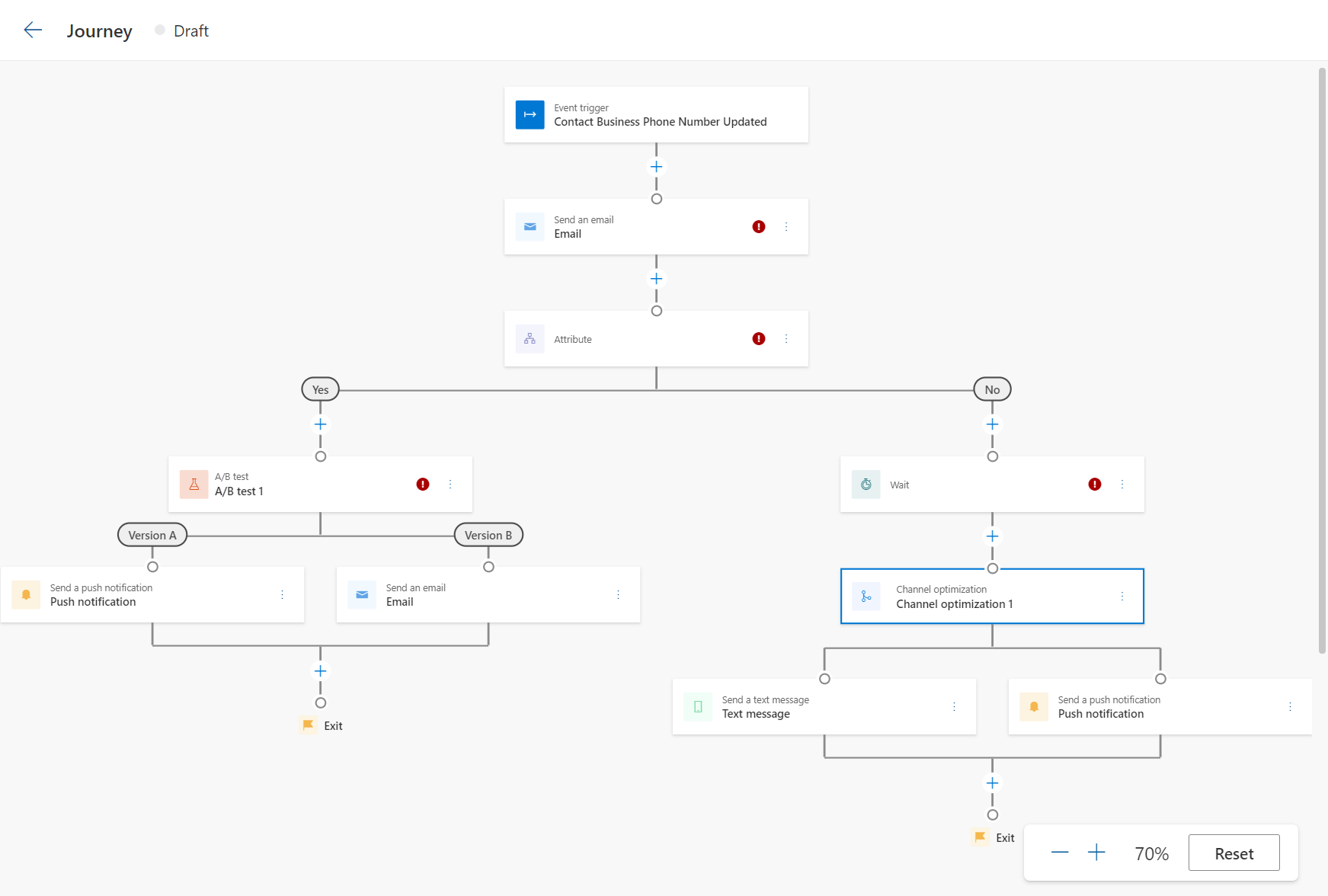 These reactions doesn’t have to be emails, but can also be push notifications or SMS. All flows and process paths can be configured in a nice drag-and-drop canvas. It is very similar to the Customer Journey designer in the Outbound Marketing area.