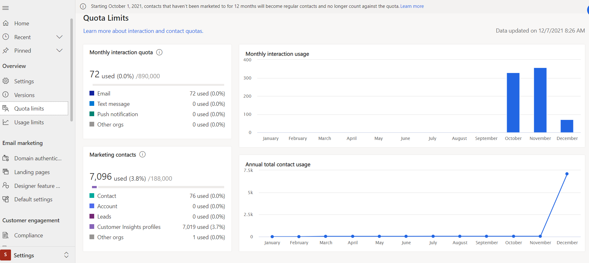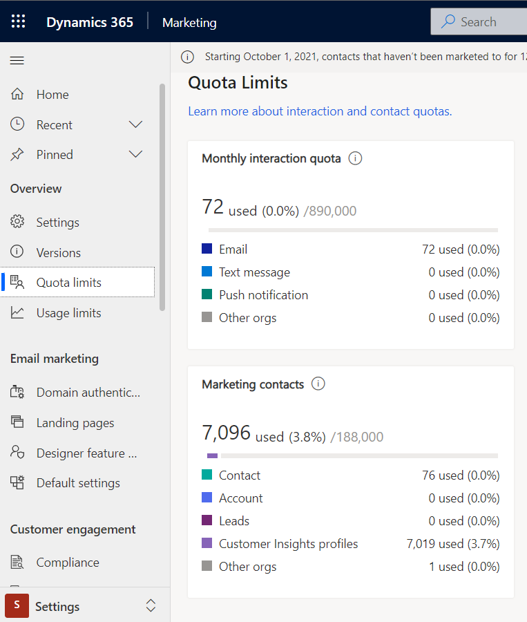 You find the Quotas area under Settings in Dynamics 365 Marketing. When presented with the Settings menu, you can quickly locate Quotas in the top of the Sitemap under Overview section as the 3rd heading under Versions.