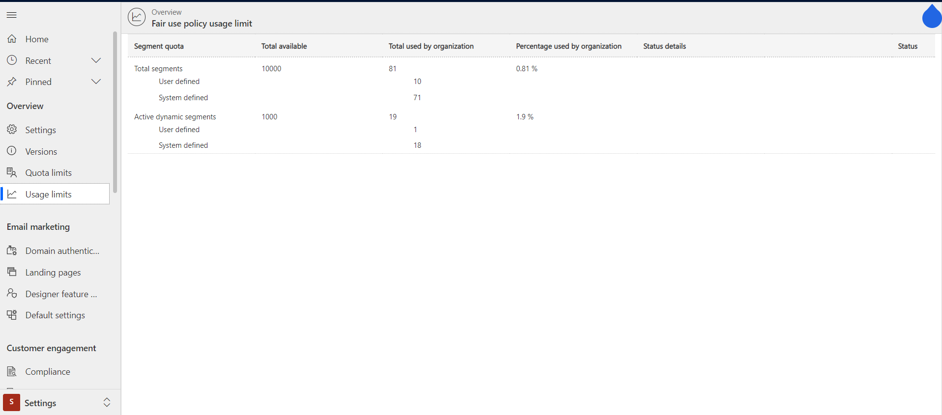 The quotas area is now available for everyone, but it is still in construction. This means that Microsoft is still working on releasing full functionality for this area. For example we are at the moment missing the Litmus inbox previews and Customer Voice information. Hopefully they will also come soon. 🙂