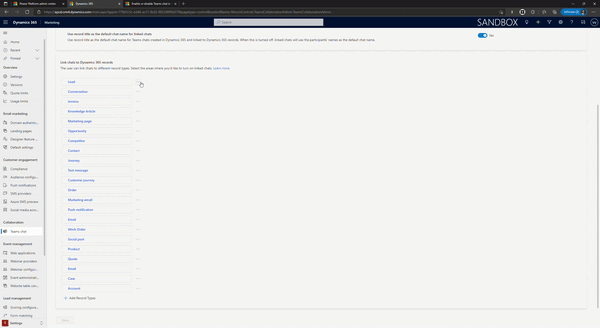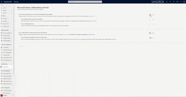 Allows pinning records to Teams directly from D365 and also suggests people that could be added. This requires tenant admin permissions.